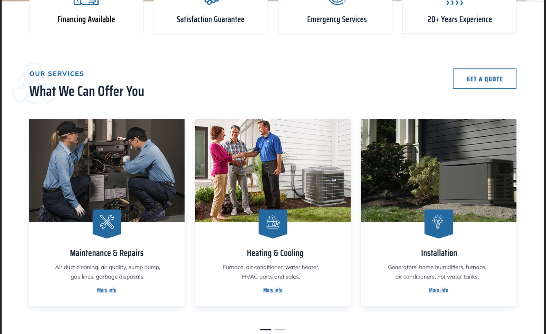 The hero section was redesigned to simplify the homepage, improve visual hierarchy, and guide users toward the most important action—contacting the company for service. The original hero area contained multiple promotional banners and competing messages, making it difficult for users to quickly understand what the company offers. The redesigned hero focuses on clear messaging, stronger hierarchy, and a more modern layout that immediately communicates the company's services.